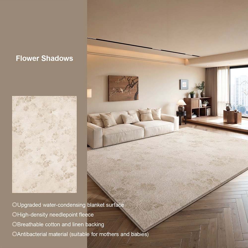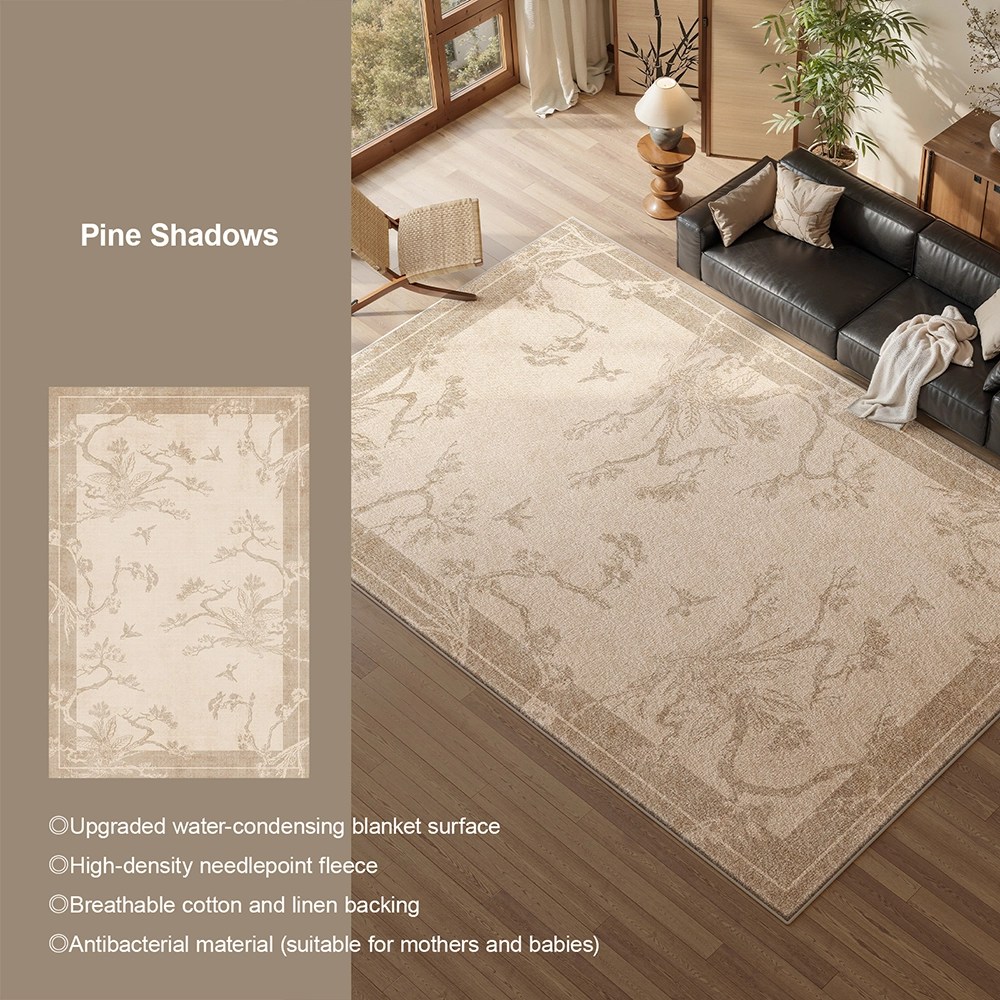 A: The Bird & Flower Waterproof Carpet is designed as a multi-room installation piece — its traditional Chinese painting aesthetic, nature-inspired design vocabulary, and practical maintenance performance make it equally appropriate across the three room typologies the product targets: living room, bedroom, and tea room/study. Size selection follows standard interior design principles: